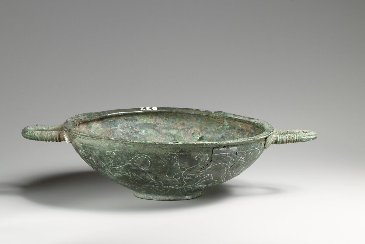 The creatures ornamenting the exterior are clearly derived from Corinthian pottery designs but here are executed with a tool that produced a fine zigzag line.