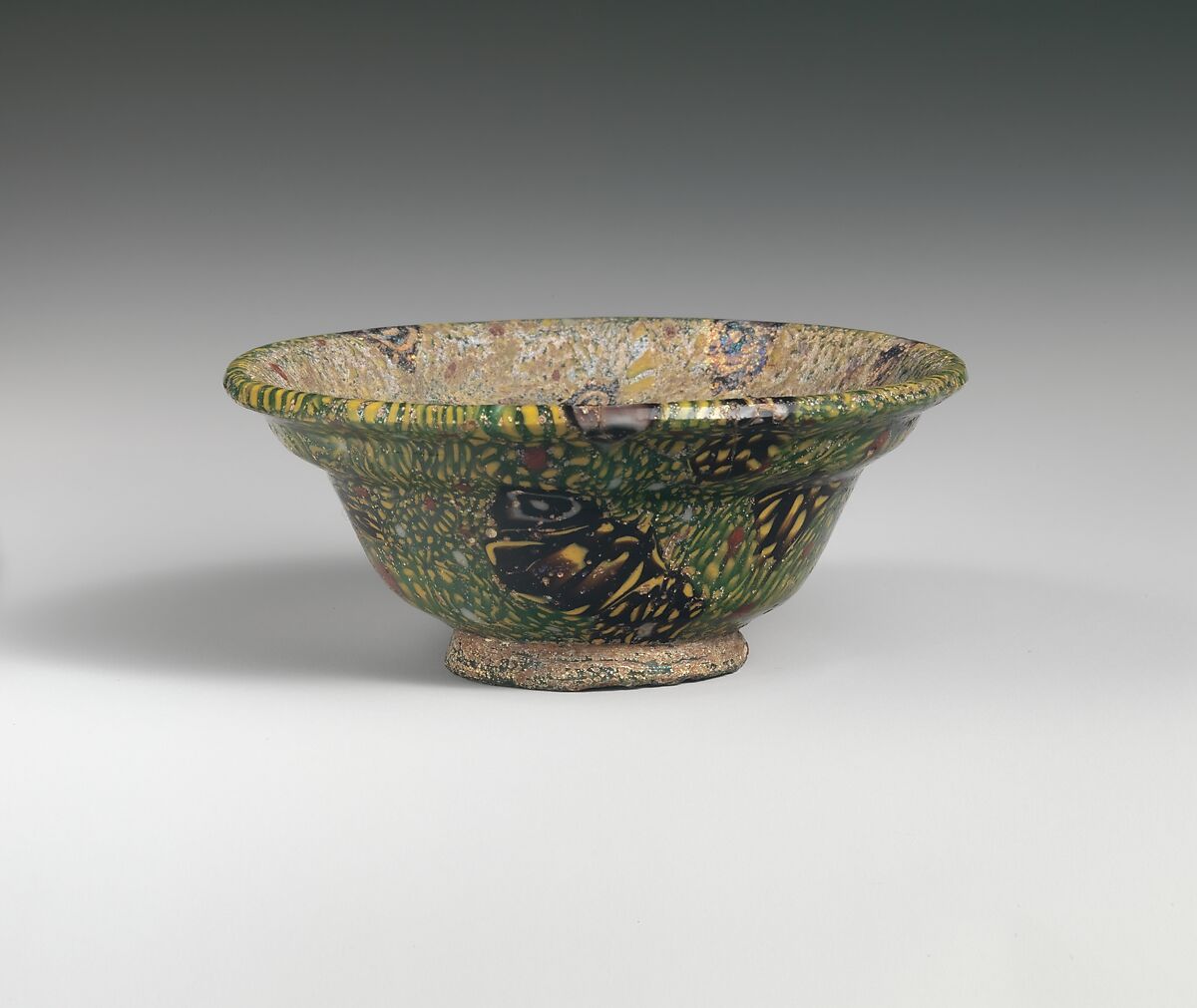 Intact, except for one small weathered chip in base ring; pitting of pinprick bubbles, dulling and iridescent weathering on interior, base ring, and bottom.