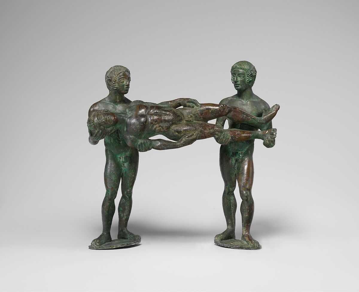 The handle is in the form of two youths carrying a dead companion.