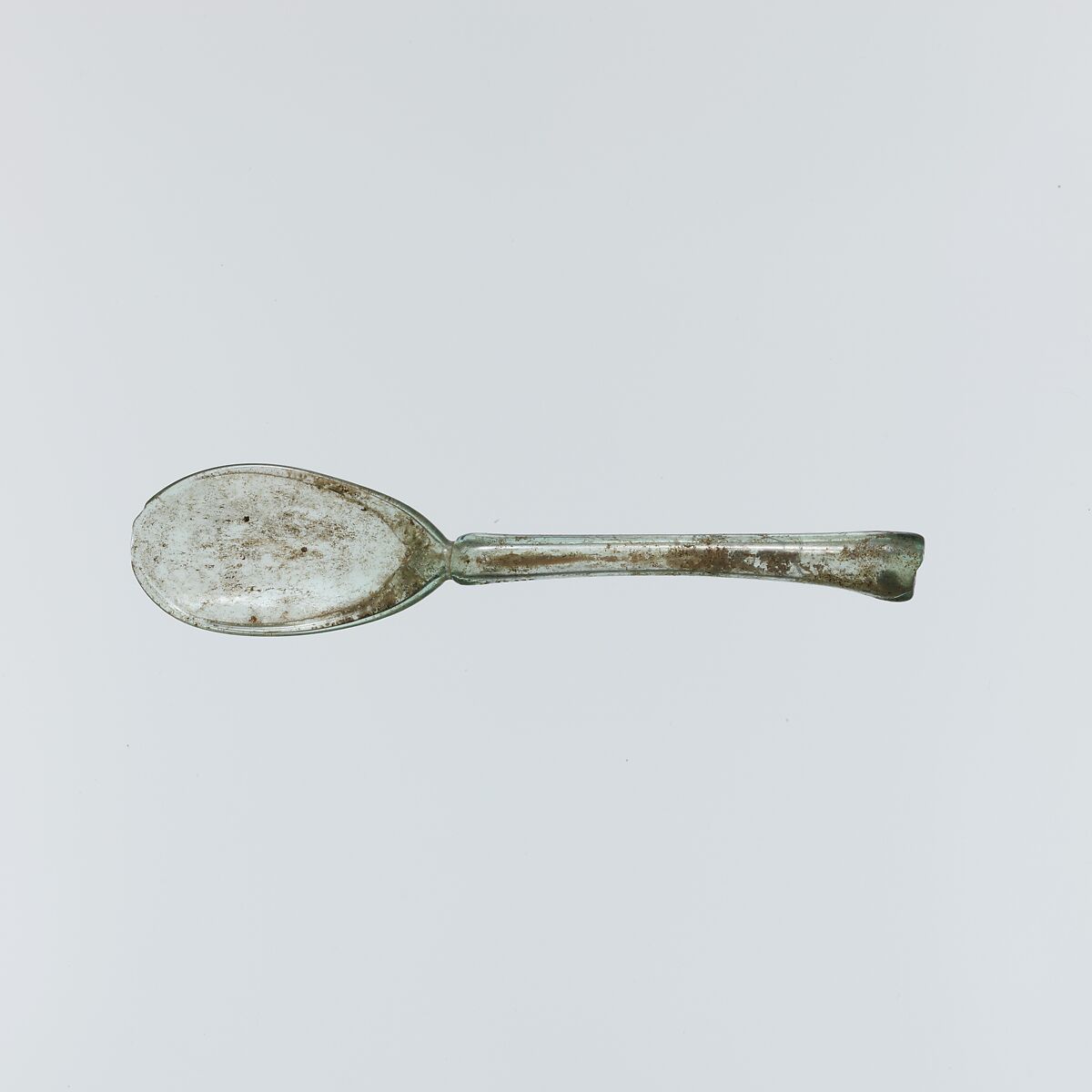 This spoon, which is said to have been found near the Sea of Galilee, was made from a single blown tube that was then tooled to shape the bowl and handle. Although rare, such glass spoons were probably produced throughout the Roman period, and they persisted even into Islamic times.