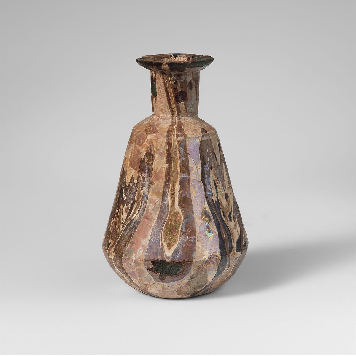 Intact, except for one weathered chip in rim and two deep weathered chips in side of body; many pinprick bubbles; dulling, pitting, and creamy brown weathering with brilliant iridescence.