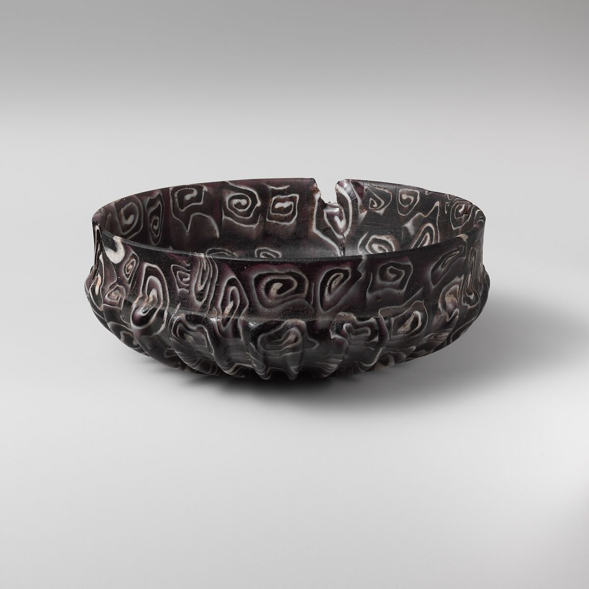 Ribbed bowls were a very common and popular type of early Roman cast tableware. Examples have been found right across the Roman world and even beyond. Those in mosaic glass like this one were intended to resemble luxury vessels carved out of semiprecious stone such as banded agate.