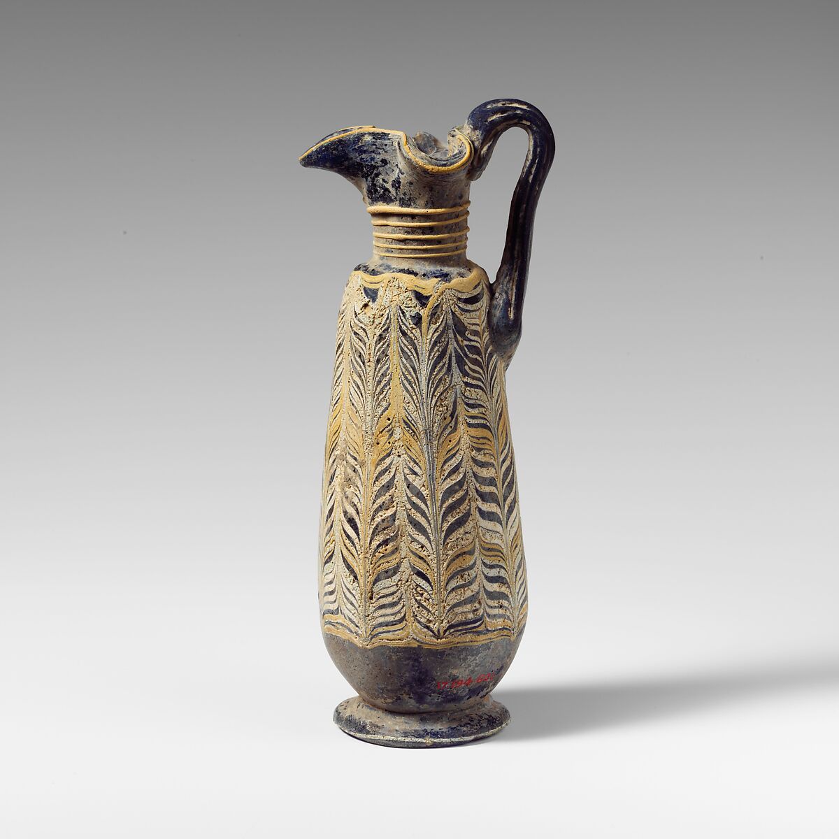 Among the rarer shapes of Mediterranean Group II vessels are the tall, slender oinochoe (jug/pitcher) with a trefoil spout and the lentoid aryballos with twisted glass canes running between the ring handles.