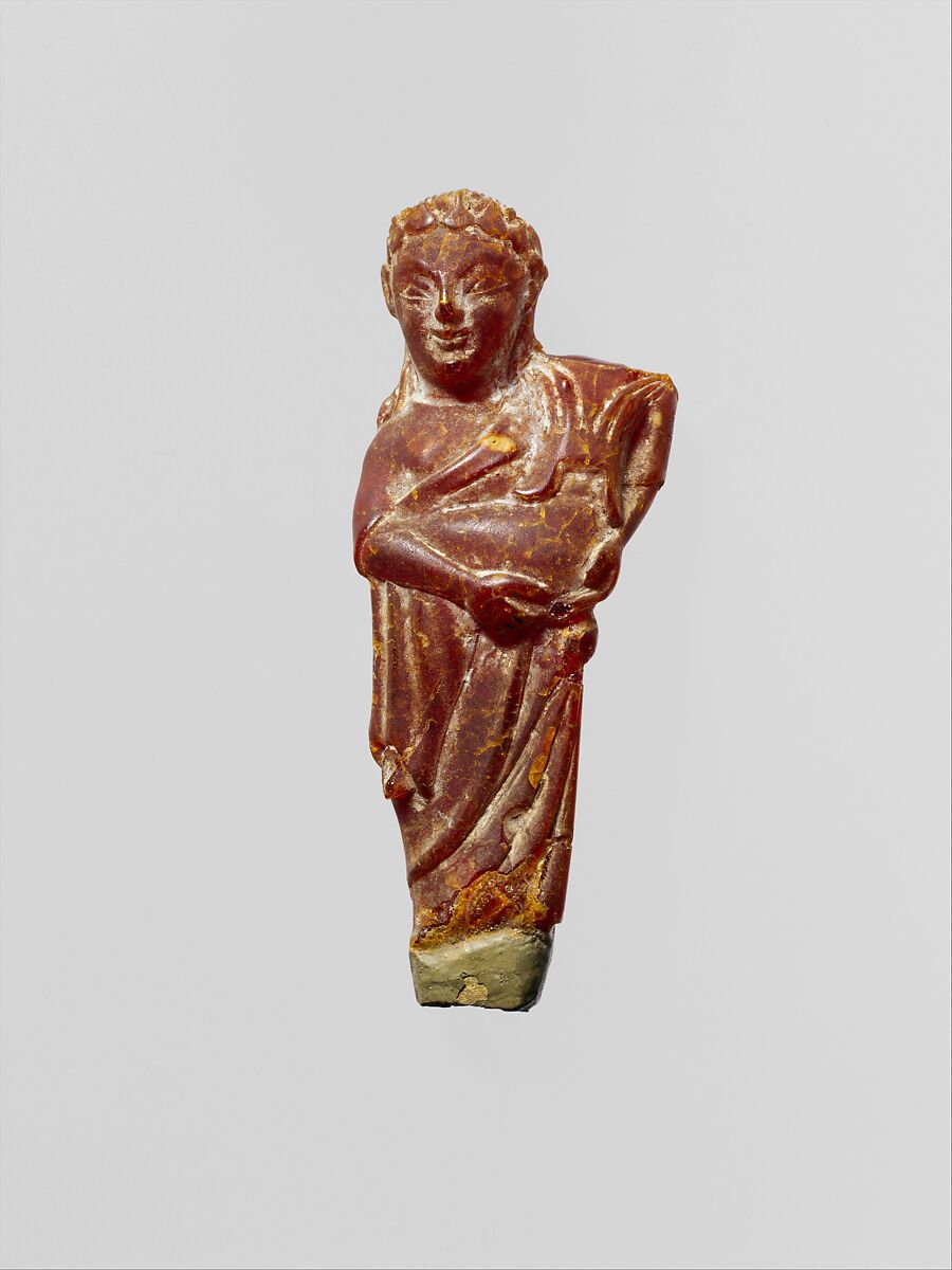 This finely carved amber depicts a standing woman carrying a child whose head is now missing. The woman wears a diadem or crown with pointed leaf-like elements, and her hair is defined by delicately indicated striations. She is dressed in a long garment that leaves her arms exposed.