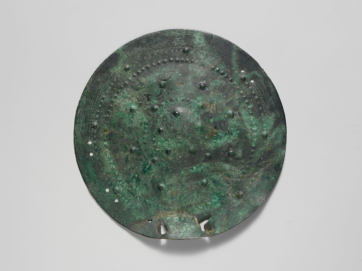 Convex bronze discs, often with punched or incised ornament, were frequently attached to wooden, leather, or bronze shields. Many of the shields found in seventh century B.C. Italic and Etruscan chamber tombs were made for ceremonial or funerary purposes; they were too fragile to have had any practical use in combat.