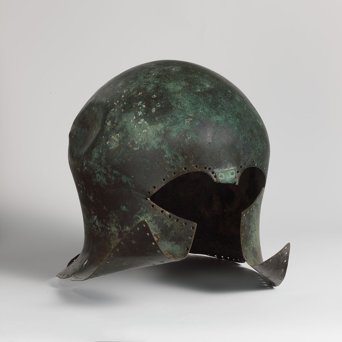 The historian Herodotos mentions the Corinthian helmet as part of the equipment of the Greek hoplite (foot soldier). As a result, the predominant type of helmet, with a rounded calotte, small openings for the eyes, and a distinct nose-piece has been identified as such. Thanks to the large number of examples excavated at Olympia, the typological variety and development are well understood. This example, said to be from Olympia, is quite early, as indicated by its unarticulated edges and the small cutout in the middle of each side.