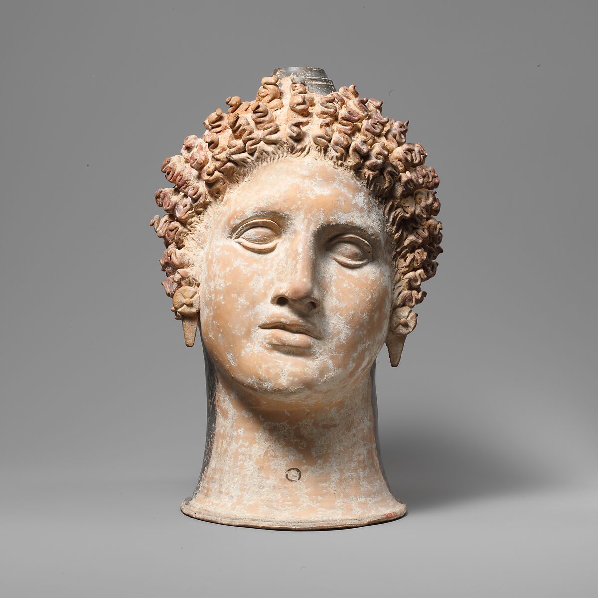 In the absence of plentiful sculptural-quality stone, artists of Southern Italy used clay to great artistic effect. The head is impressive for its size, the sensitive rendering of the face, the texture of the hair, and the careful articulation of the earrings.