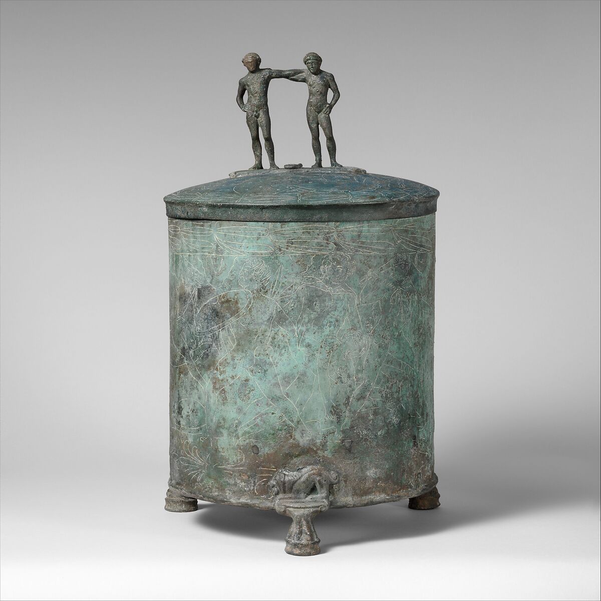 The engraved cylindrical frieze shows Hercules, wearing his lion skin and brandishing his club as he fights the Amazons with fellow Greek warriors. On the lid, dragon- and horse-headed sea monsters flank a dolphin. The solid-cast lion's-paw feet have attachments in the shape of a crouching lion. The handle shows a nude man and woman standing with their outer arms akimbo.