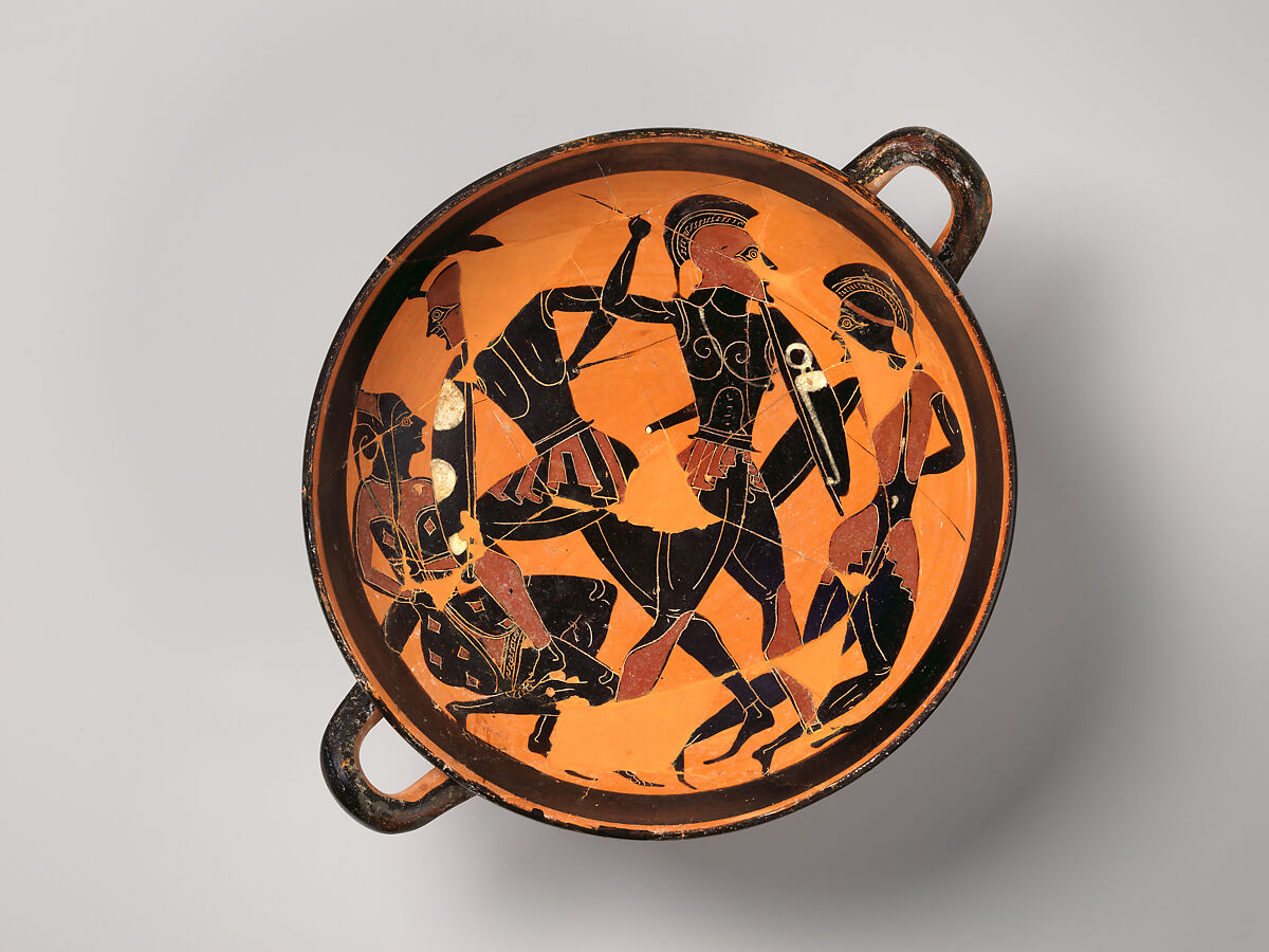 Typologically and stylistically, this is a remarkable cup. Eye-cups appeared about 540 B.C. Normally they have a Gorgon's face on the interior. A scene occupying nearly the whole interior is rare in black-figure. The influence of Lydos is evident in the imposing figures and clear composition.