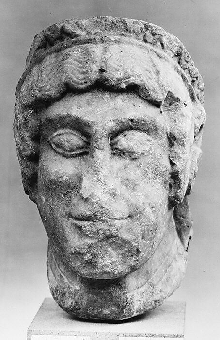 Marble archaic female head wearing stephane and earrings in form of rosettes. The piece has been recut in modern times. Parts of the surface show ancient weathering. The eyes have been reworked and the ears have been recut over the hair.