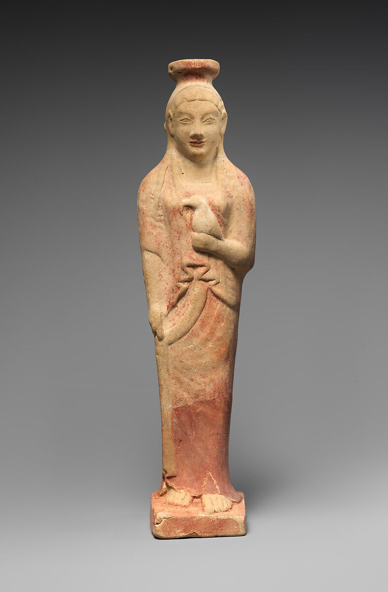 - Title: Terracotta alabastron (perfume vase) in the form of a woman holding a dove