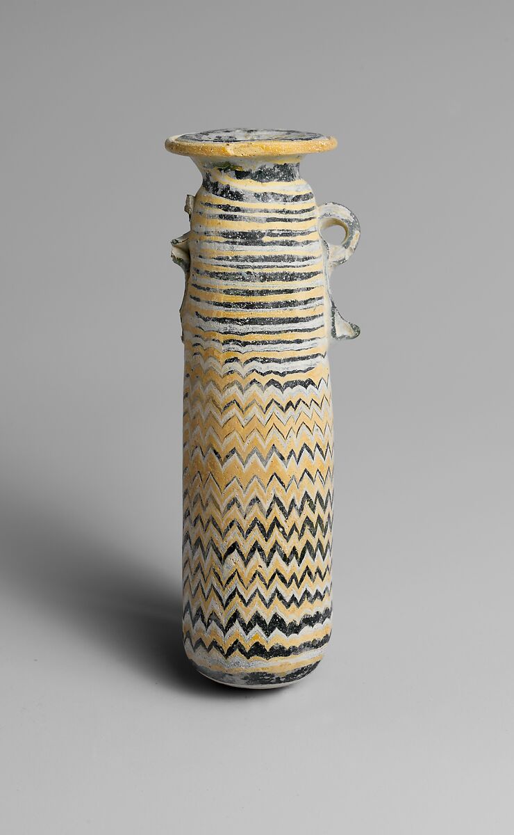 Yellow trail attached at edge of rim-disk; another yellow trail overlaid with turquoise blue applied under rim-disk, wound down in a spiral, then both tooled into an uneven, close-set zigzag pattern on lower two-thirds of body to bottom, where the trails end in irregular swirls.