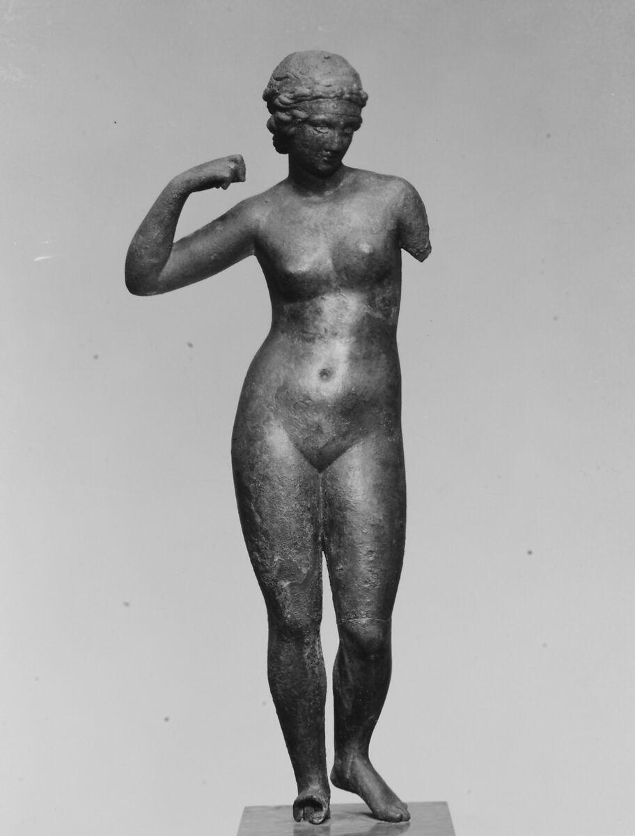 The Greeks did not represent the goddess Aphrodite as nude in large-scale statues until the middle of the fourth century B.C., when the sculptor Praxiteles created the famous Aphrodite of Knidos. Representations of the nude Aphrodite in a variety of types and media became widespread by the Late Hellenistic period. This statuette is a variant of the Aphrodite Anadyomene (hair-binding) type. The pose may have been inspired by a work that had a canonical status equivalent to the Aphrodite of Knidos, a famous painting of Aphrodite Anadyomene by Apelles, court painter of Alexander the Great. The variant exemplified here was clearly popular in this size and medium, since several examples are known.