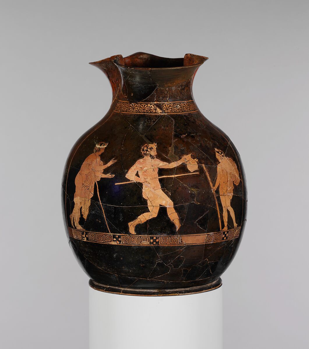 The torch held by the figure at right and the jug brandished by the one in the center indicate that the men are "on the town." The shape of the vase situates their spree during the festival of the Anthesteria, devoted to Dionysos, the god of wine.