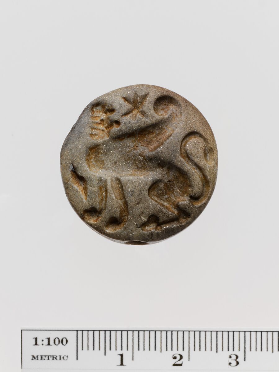 Sphinx, with recurving wing, tufted tail and head turned back; long hair is carved in horizontal layers; Daedalid fashion.