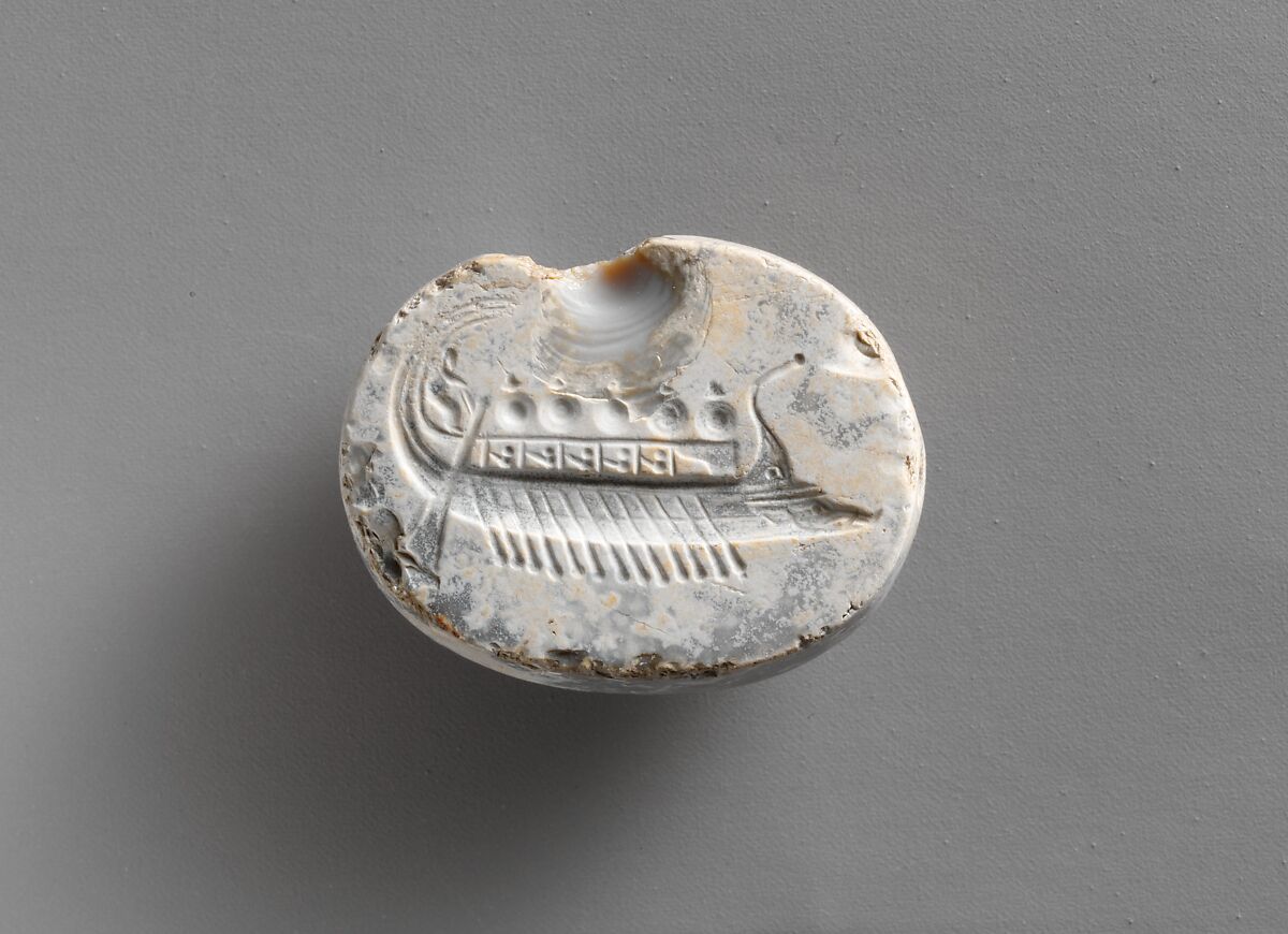 Scaraboid gem engraved of a ship with steersman, oarsmen and warriors.
