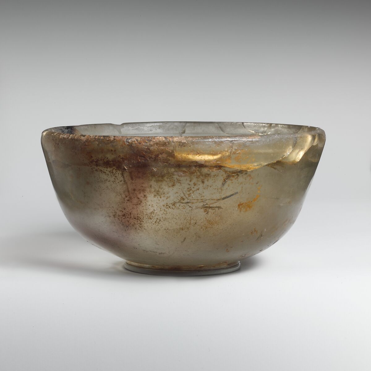 Intact, but many internal strain cracks around side below rim and in bottom; some pinprick bubbles; isolated patches of deep pitting and brownish iridescent weathering.