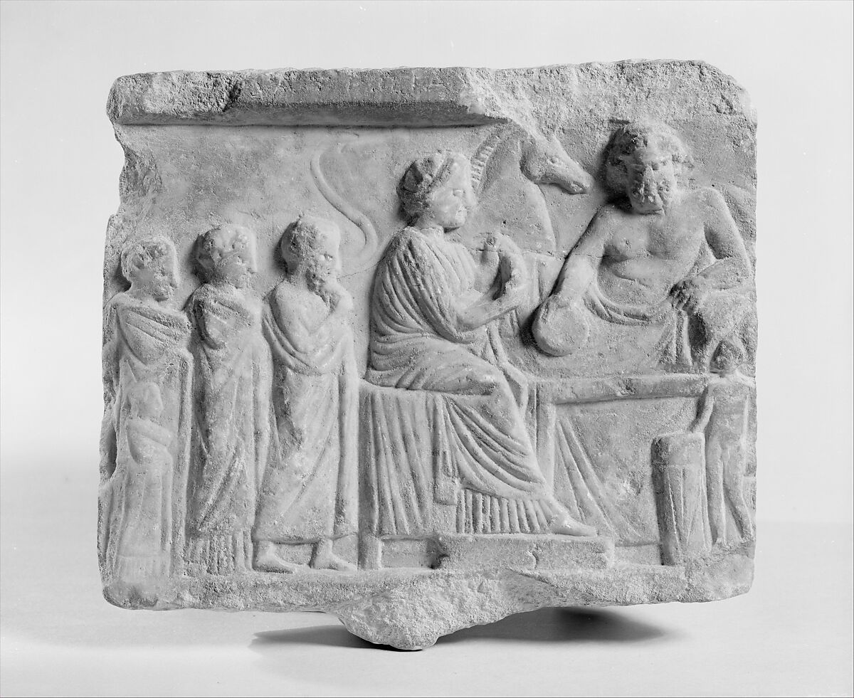 A hero was a deceased person who exerted from his grave a power for good or evil and demanded appropriate honor. The cult was concentrated at the grave, which was marked off as a special precinct and known as a heroon. As with the Olympian gods, there were animal sacrifices and offering of food and libation. The principal cultic activity was a feast of the living in company with the dead hero and in his honor. Votive reliefs often show the hero, as here, reclining at such a meal and being approached by worshipers, shown in smaller scale.