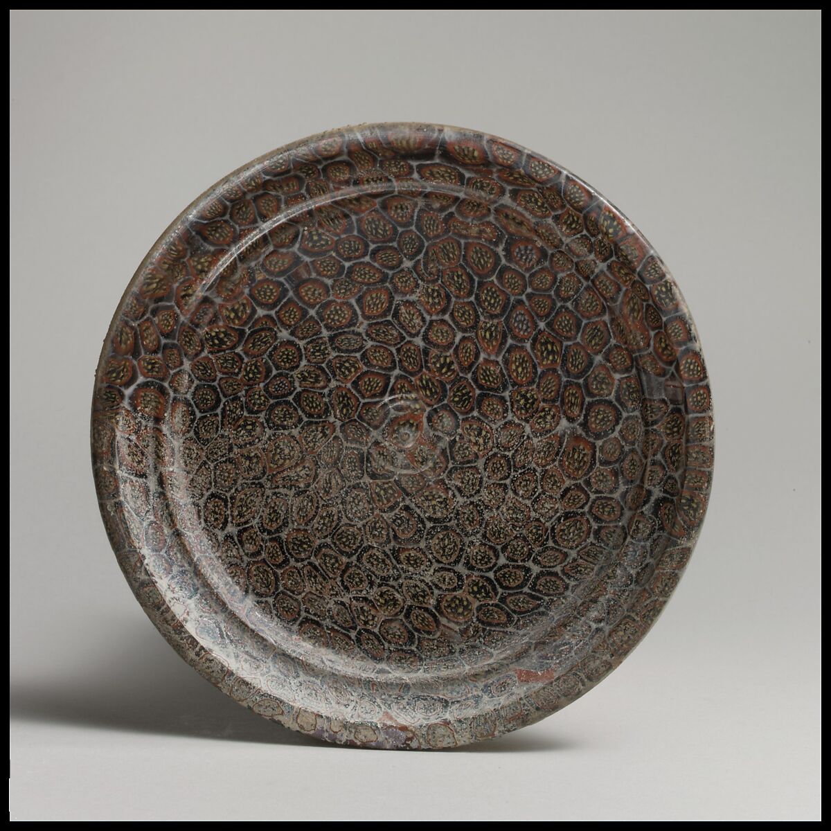 Composite mosaic pattern formed from polygonal sections of two similar canes: one in a purple ground outlined in white, each with a red circle surrounded a cluster of yellow rods, the other in a purple ground outlined in white, each with a red circle surrounded a cluster of white rods. On interior, central relief knob and small raised circle.