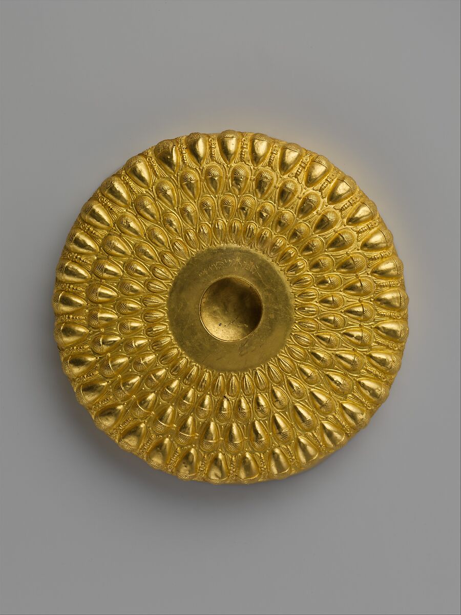This libation bowl, decorated with bees, acorns, and beechnuts, is worked in repoussé. Phialai decorated with acorns were being made by the late sixth century B.C. and must have been traditional. Acorns could also be seen on the phialai held by the caryatids of the Erechtheum on the Akropolis in Athens, as we learn from Roman copies found in Hadrian's villa at Tivoli.