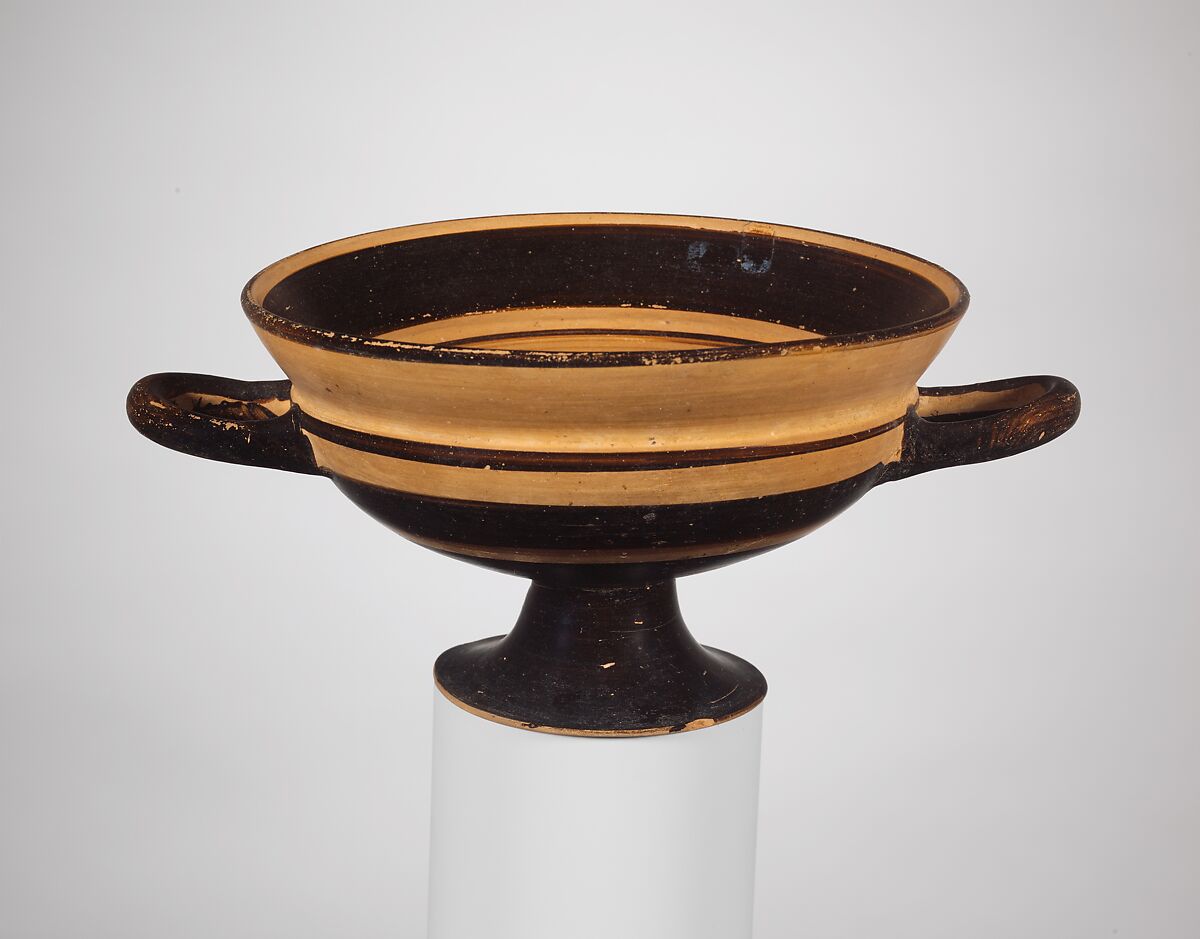 The shape is derived from Attic Little Master cups, specifically lip-cups. The finely executed concentric circles on the interior are characteristic of East Greek production.