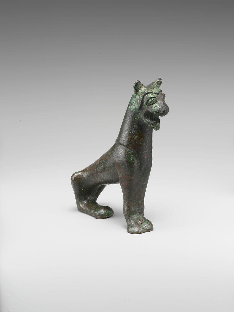 The pose and attenuated form of this solid-cast bronze are reminiscent of the monumental stone lions that guard a street at the Greek sanctuary of Apollo on the island of Delos. This lion may once have ornamented a large bronze vessel or brazier and is perhaps a product of Vulci.