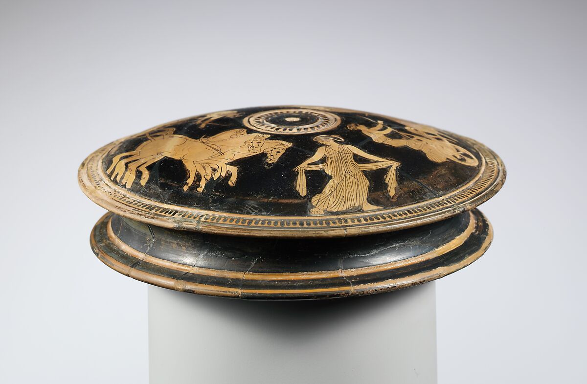 Women driving chariots at full tilt are rare in Greek mythology. For that reason, the figures in this scene have been identified as the formidable daughters of the mythical king Danaos. There were fifty daughters, known for their accomplishments at hunting and warfare. They had been forced to marry their fifty cousins, sons of king Aigyptos, but slew their husbands on the wedding night. Thereafter, they found new spouses.
