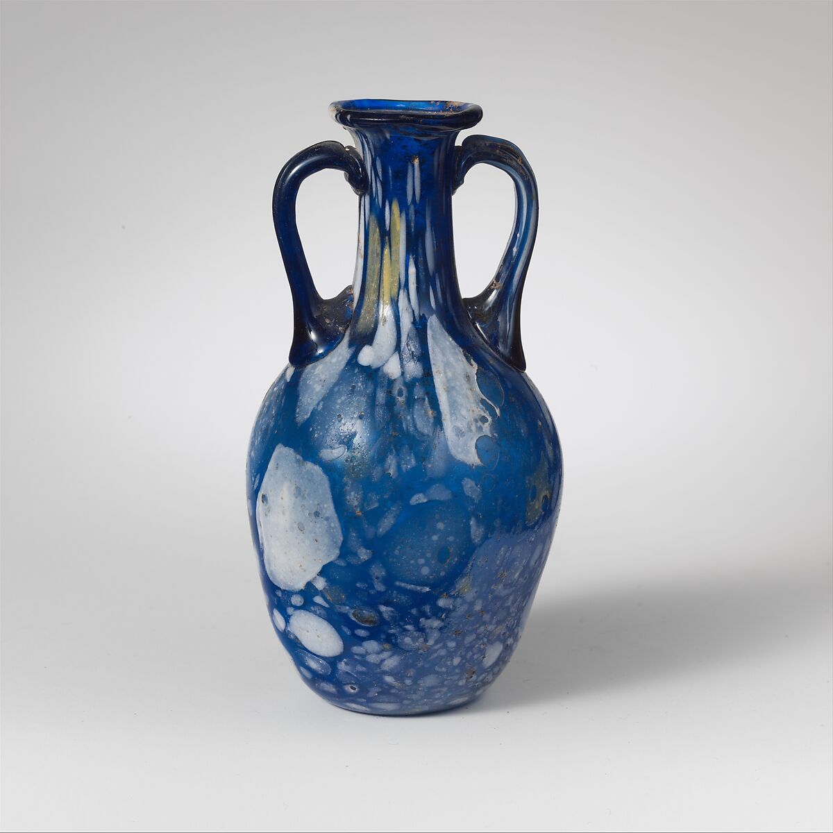 Translucent cobalt blue; handles in same color, but one streaked with opaque white; splashed decoration in opaque white and opaque pale yellow.