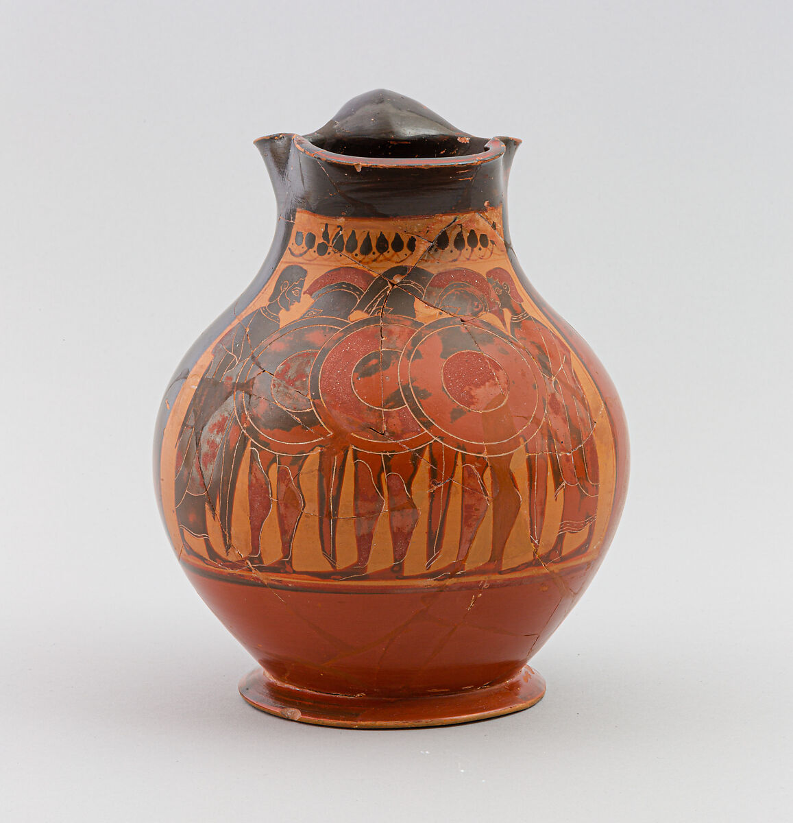 The Greek heavy infantry fought shoulder to shoulder behind overlapping round shields. Here the shields of three hoplites dominate the composition and emphasize with their concentric rings the swelling roundness of this little pitcher.