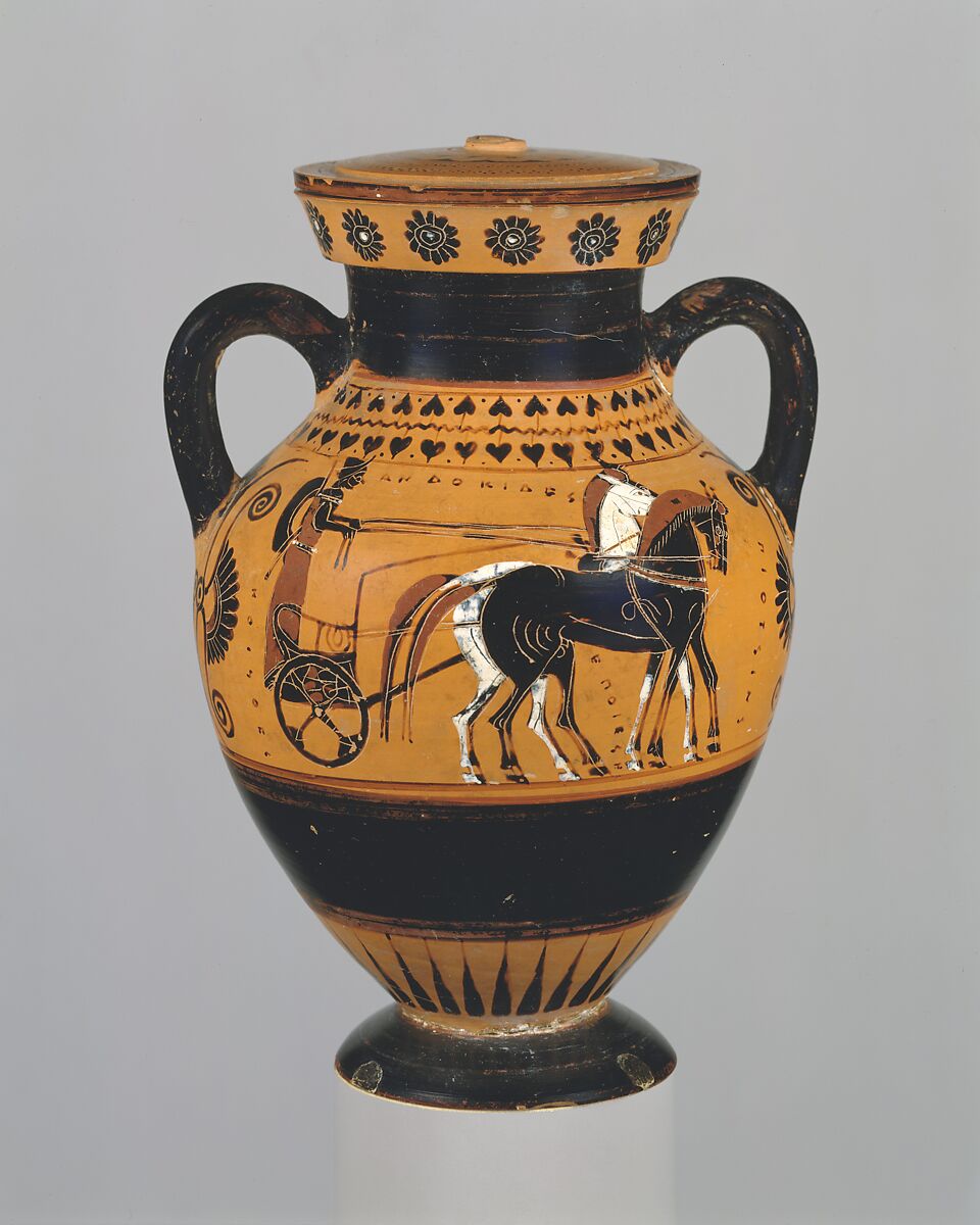 This is the earliest preserved vase with the signature of the potter Andokides. Thus it constitutes a most important piece of evidence concerning the beginnings of the artist from whose workshop the red-figure technique emerged. It shares features with vases of Nikosthenes and Group E. The shape and the allocation of ornament—the zone of ivy for instance—testify to an independent artistic personality.