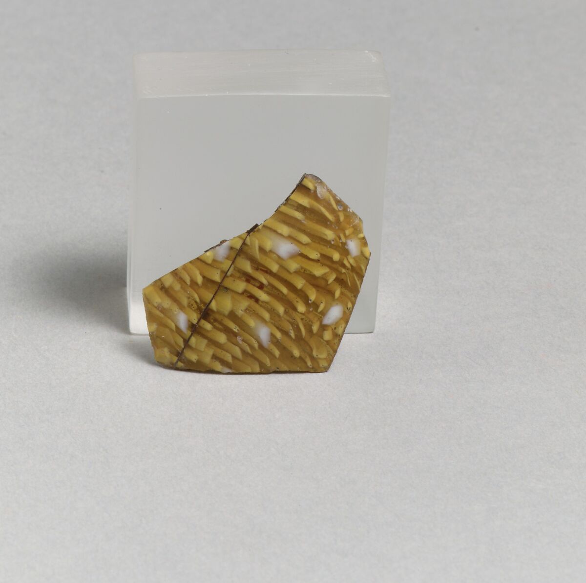 Mosaic pattern formed from sections of a single cane in a yellow ground with a pattern of opaque yellow rods around a central white rod.