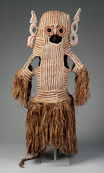 The art and religion of the Asmat people of southwest New Guinea center primarily on the spirits of the recently dead. Nearly all Asmat subgroups celebrate, or celebrated, the mask feast, a series of rituals culminating when the dead, personified by performers wearing full-length body masks, return to visit the community. The rites involve two types of masks. The first, a single conical mask depicting a legendary orphan, appears as a comical prelude. The second type of mask, seen here, portrays the dead. Each mask of this type is named for a specific individual. At the climax of the ceremony, the masked performers representing the dead emerge from the forest and tour the village, where they are offered food and hospitality. They eventually arrive in front of the men’s ceremonial house, where the dead and the living join in a dance, which continues long into the night. The following morning the dead, now properly fed and entertained or frightened by threats of violence, depart for safan, the realm of the ancestors.