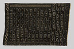 Women's wrappers were worn during important transitional periods: prior to the consummation of marriage or immediately following childbirth. Divided into five sections - four thin bands along the edges frame a larger central field - this wrapper is an early example of bogolanfini. The thin band adorned with little polka-dots marks the upper-part of the wrapper which is often hidden when worn. These little dots (a motif called tigafaranin=little peanut shell) symbolize the beaded belt baya that young Bamana women wear around their waist, which is identified with seduction and fertility.