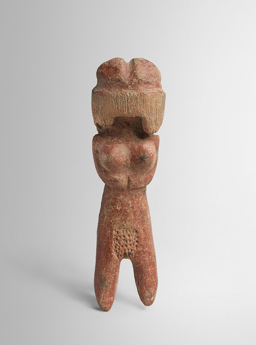 In the third millennium B.C., inhabitants of Ecuador's southwest coast developed the earliest known ceramic figurine tradition in the Americas. Noted for their stylized representation, these clay statuettes are rooted in earlier stone figurine traditions from the same region. While some of the ceramic figures are relatively plain, consisting of simple grooved plaques reminiscent of their stone predecessors, others, like the one pictured here, display substantially more detail. The figurine, certainly a female, has a red slipped body with rounded breasts and strippling along her lower abdomen. Her hands are clasped beneath her chest and her legs are splayed. As is typical of many Valdivian statuettes at this time, the figure's face is almost completely obscured by an elaborate coiffure that cascades down her back. Found in domestic as well as ceremonial contexts, some scholars have suggested that Valdivian figurines represent fertility figures, although this interpretation remains tenuous.