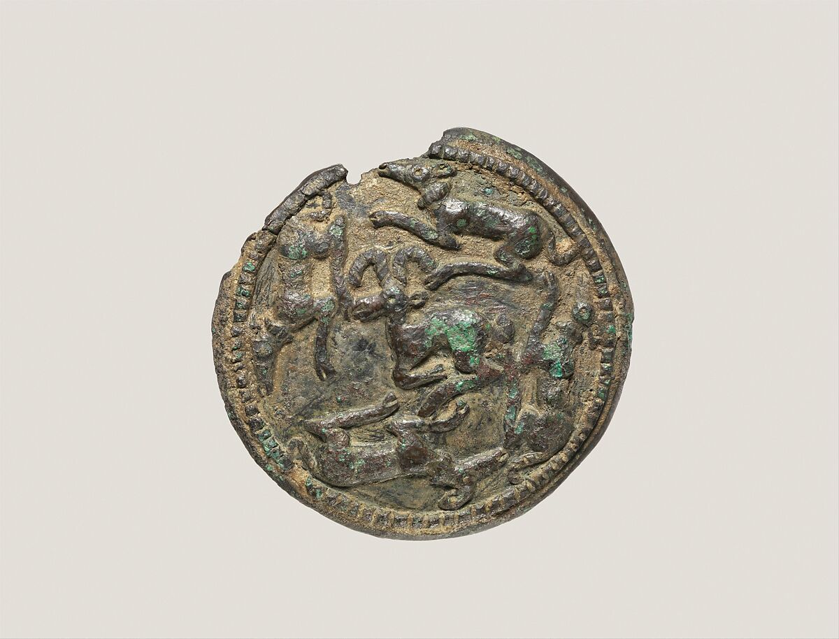 Similar dogs and goats are known from Georgian belt clasps suggesting the attribution of this disk to the first to third centuries A.D. Collared dogs, however, are unusual in the art of the Caucasus.