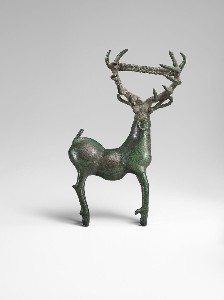 Brooches similar to this piece have been excavated in sites in eastern Georgia. One virtually identical to the Museum's example comes from grave 199 at the site of Medzhi and is dated to the end of the third or the beginning of the fourth century. The excavated example has preserved elements that are now missing from the one here: an iron pin in the back, bronze chains with dangling finial elements suspended from the feet of the stag, as well as spirals and disks suspended from loops in the antlers and mouth.