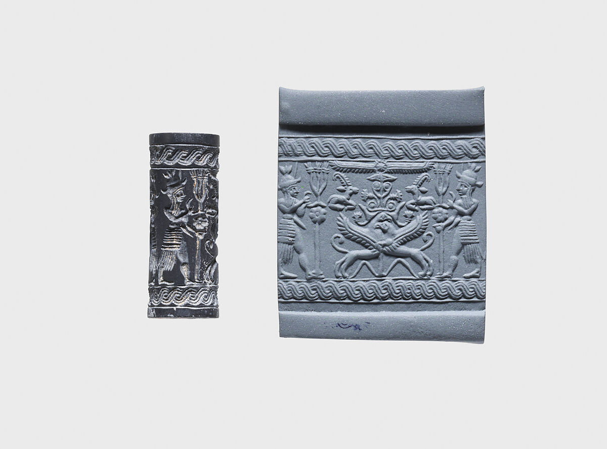 - Title: Cylinder seal and modern impression: weather gods framing heraldic griffins at tree below winged sun disc and ibexes