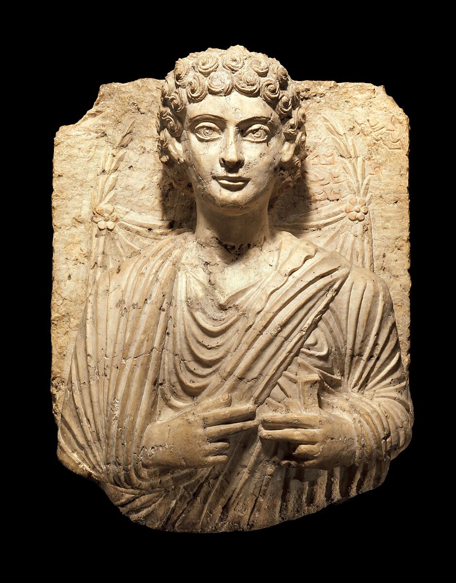 The relief depicts the upper body of a youthful, beardless man dressed in a Greek garment known as a himation, which wraps around his right arm like a sling, holding a small object, probably a schedula (book roll), in his left hand. His expression is serene, although the intensity of his gaze is emphasized by the large size of his eyes, the modeled eyelids, and the incised concentric circles indicating the iris and pupil of each eye. His hair is depicted as rows of uniform, stylized snail-like curls that cover his head like a cap. The sides and top of the head are rendered in detail, giving a three dimensional aspect to the relief. He stands in front of a dorsalium (draped cloth) affixed by rosettes to a pair of curving leafy branches. An inscription in Palmyrene Aramaic, visible directly to the right of his head, gives his name and lineage, ending with an expression of sorrow common on funerary reliefs at Palmyra. Another inscription, to the right of this one, names a different individual; originally, this slab was probably a double portrait that was cut into two after its removal from the tomb. Small chips and cracks in the surface are due to the use of soft local limestone. Traces of red pigment are visible in the inscription and on the two rosettes. Stylistically, the relief belongs to an early group of Palmyrene male funerary portraits dating to about 50–150 A.D., evidenced by the treatment of the coiffure and the figure’s beardlessness as well as by the manner in which the eyes are carved. In fact, the date can be narrowed further to late in this period (ca. 125–50 A.D.) on the basis of the sensitively modeled carving of the face and the use of pattern-like semicircular shapes among the folds of the himation.