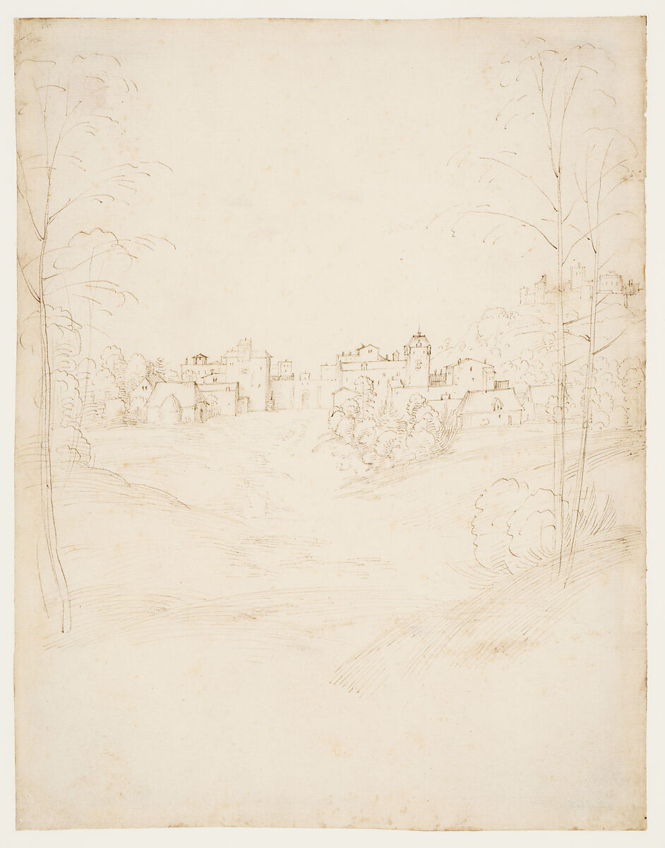 A leading painter in early sixteenth-century Florence, Fra Bartolomeo was also a gifted and prolific draftsman. Among the vast number of surviving drawings by his hand is a remarkable group of independent landscape studies produced at a time when works of this genre were still uncommon. Achieved with clean strokes of the pen and considerable freedom and economy of line, the rural townscape gives the impression of having been observed from nature. Indeed, the artist frequently traveled the Tuscan countryside to sketch in the open air. Yet the sheet is not purely a study after life: certain details, such as the tall tower at right, closely recall an engraving by Albrecht Dürer, while the trees in the foreground are contrived as a frame for the scene beyond. Fra Bartolomeo adapted this composition for the background of a painting of the Nativity (Art Institute of Chicago).