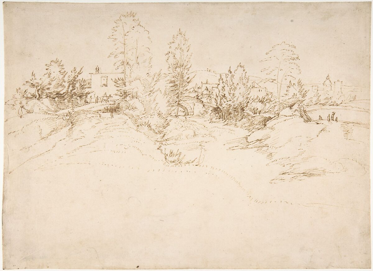Dated about 1508, this drawing can be considered among the earliest pure landscape studies in European art. Confining himself to the use of pen and ink, Fra Bartolomeo employed a great variety of strokes, from dots to dashes to hatches, in order to convey the textures and details of the Tuscan landscape. Fra Bartolomeo also used the void of the paper to great effect in expressing the expansiveness of his subject. Like other similar landscape studies by him, this sheet appears to have been drawn directly from nature. A few such drawings were used in the backgrounds of paintings. This drawing is one of a group kept until recently in an album compiled about 1730 by the Florentine art historian Niccolò Gabburri (1675–1742) which included landscape studies now in the Museum's collection (nos. 1975.1.270 and 57.65).