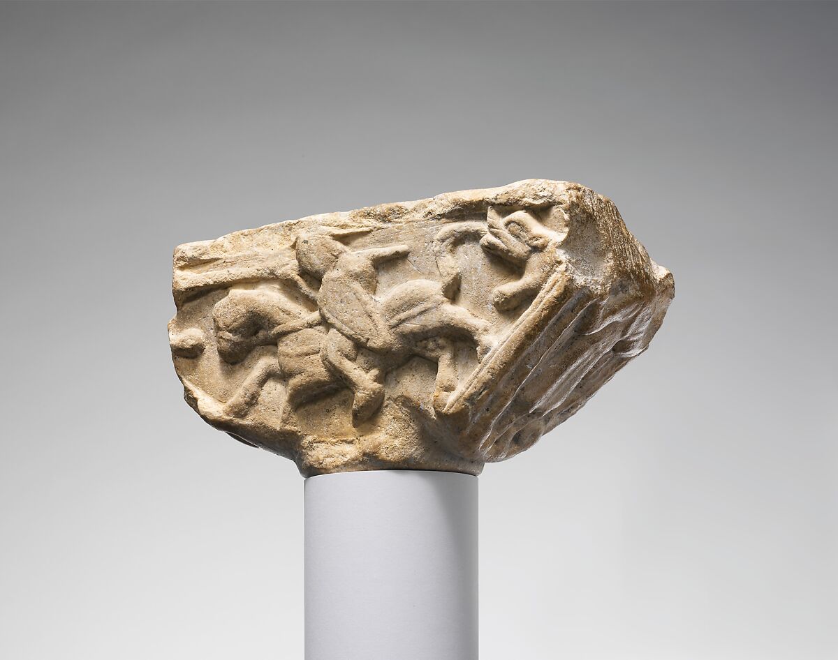 Bashford Dean (1867–1928), founding curator of the Department of Arms and Armor, formerly owned this early medieval capital. As part of his large private collection of arms and armor, Dean eagerly sought out and acquired works of art, which he called documents, if they accurately depicted historical armor and weapons, particularly rare or early types. In this case, the capital is carved with an armored cavalryman, equipped with a teardrop-shaped shield, and shows features that were characteristic of the eleventh and twelfth centuries.