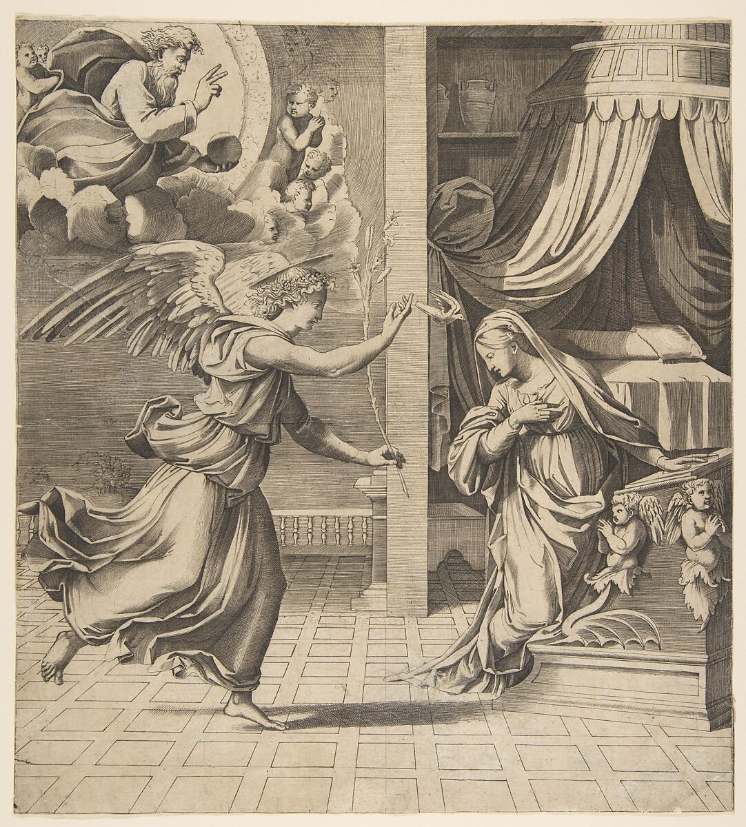 - Title: The Annunciation; the archangel Gabriel at left approaching the Virgin kneeling in prayer at right, God the Father in the upper left