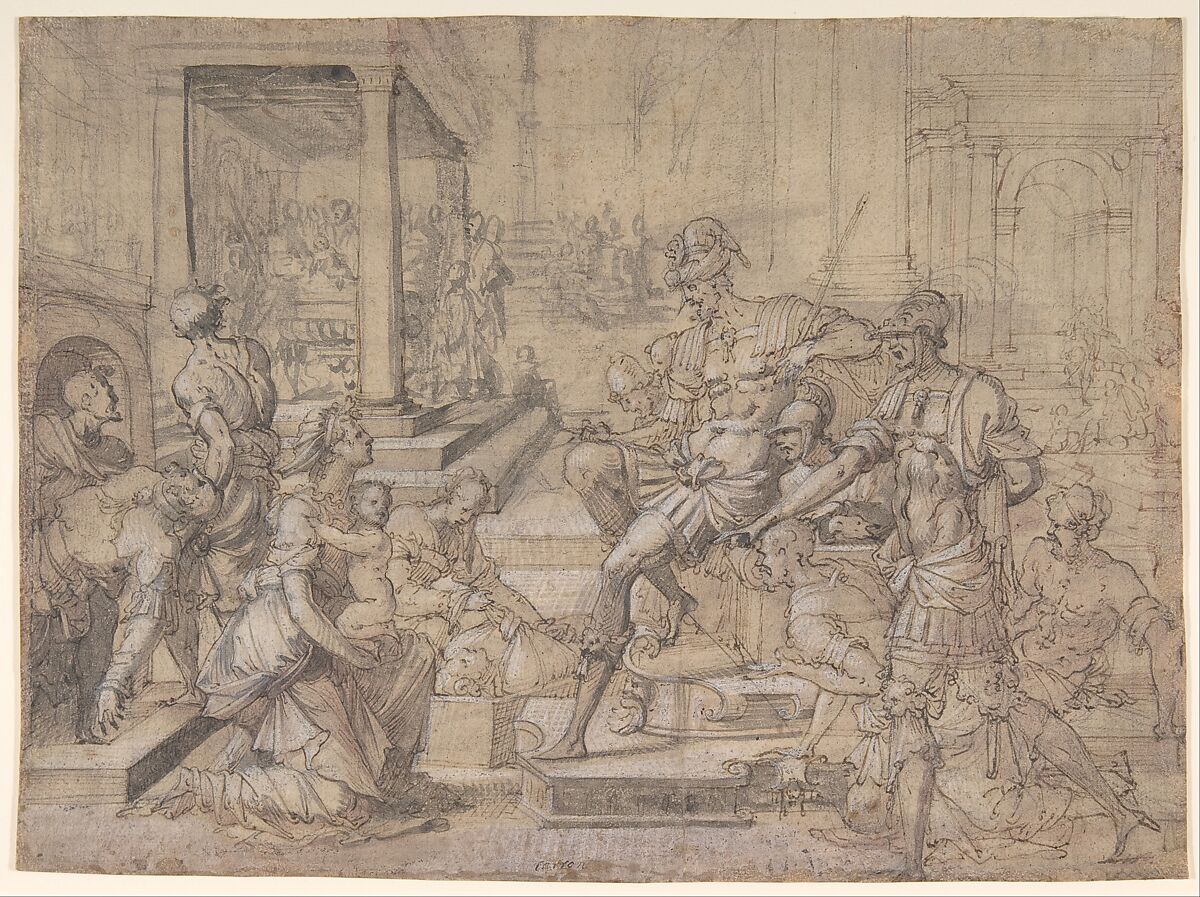 This is one of a small number of unassailably autograph sheets by his hand. It is connected to a set of eight tapestries illustrating the life of St. Mamas—of which three survive today-- commissioned in 1543 for the cathedral in Langres.