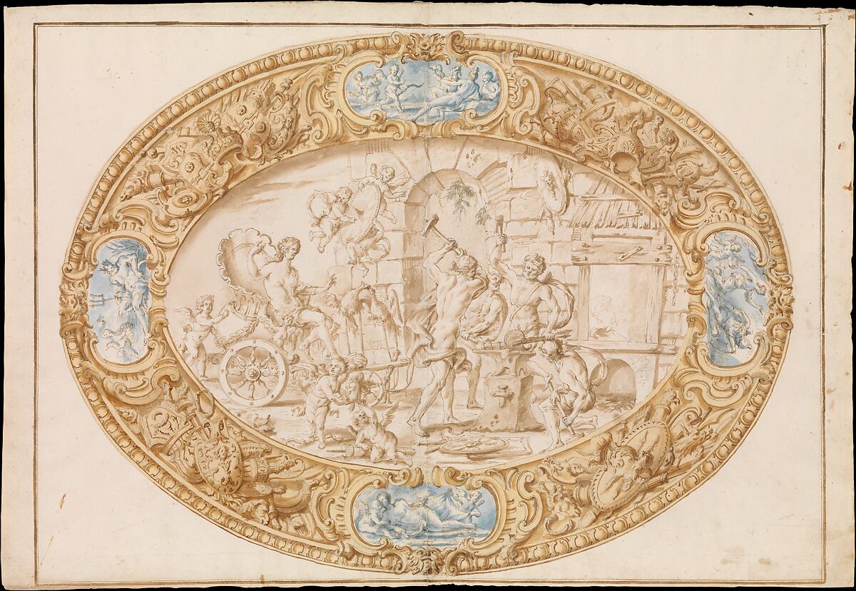 Full-scale working drawing for a large oval gilt silver dish with a wide border. The central oval compartment shows a scene of Venus at the forge of Vulcan. the surrounding border is decorated with weapon trophies, close to the well-known designs by Polidoro da Caravaggio, and contains four plaques or insets showing Gods, among which Neptune, Diana, Venus and a third female goddess (possibly in silver or grisailles enamel painting).