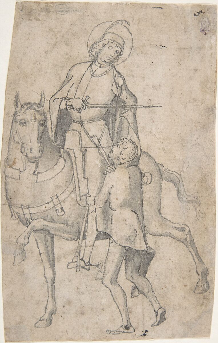 This small study appears to have been preparatory for an altarpiece in the Zara Cathedral, which Carpaccio probably undertook in 1493; although the drawing omits the landscape in the painting, it represents many other details of similar design. The subject is based on an episode from the life of Saint Martin of Tours (ca. 315-397 A.D.), as told in Jacobus de Voragine's 'Golden Legend.' The saint, a young soldier in the Roman army, is seen here on horseback, in the act of cutting off a piece from his cloak with his sword to clothe the beggar standing by his side toward the center. Vittore Carpaccio was the leading painter of late fifteenth-century Venice, along with Giovanni and Gentile Bellini.