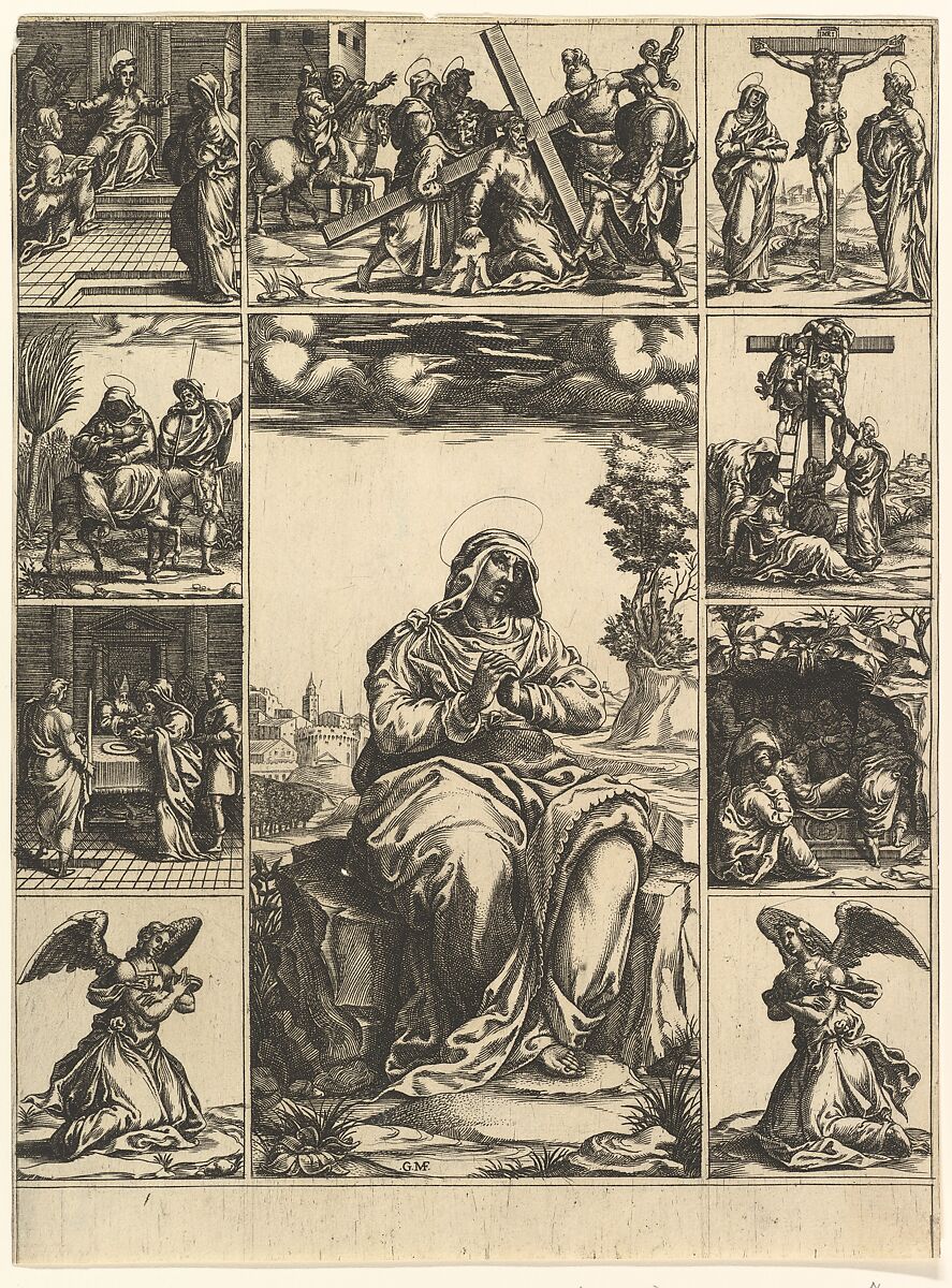 - Title: The Virgin of Sorrows; an image of the Virgin Mary surrounded by nine vignettes depicting scenes of her life