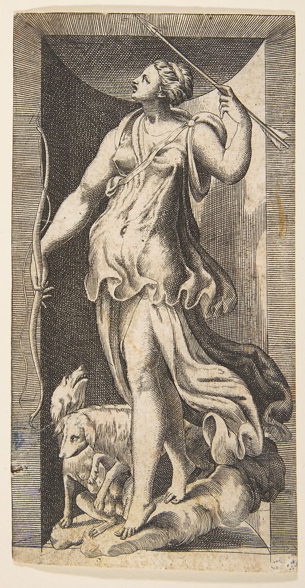 - Title: Diana the huntress acompanied by her dogs standing in a niche