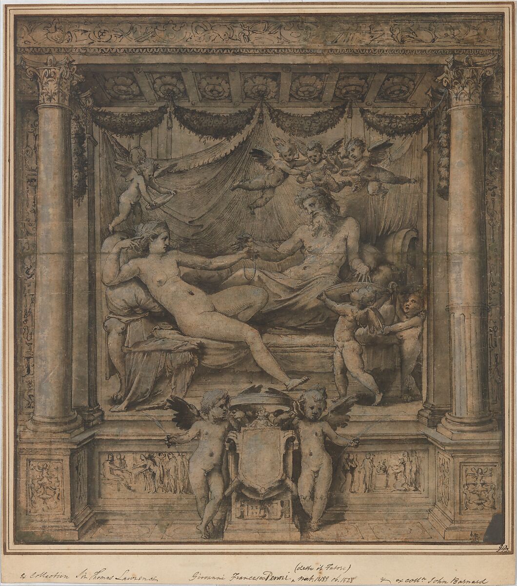 Élève doué de Raphaël, Perino del Vaga figure parmi les artistes les plus importants et les plus influents du XVIe siècle. Cette étude raffinée, qui montre Jupiter et Junon alanguis sur un lit, est un carton réalisé en vue d’une tapisserie aujourd’hui perdue, de la série Les Amours de Jupiter, qui illustre les rendez-vous galants et clandestins du dieu. Les tapisseries avaient été commandées par Andrea Doria, héros naval et chef de la République de Gênes, pour qui Perino travailla de la fin des années 1520 aux années 1530. Remarquable par ses dimensions monumentales, sa finition parfaite et la riche combinaison de l’encre, du lavis et des rehauts de blanc, le dessin est une démonstration magistrale des talents de dessinateur de l’artiste.