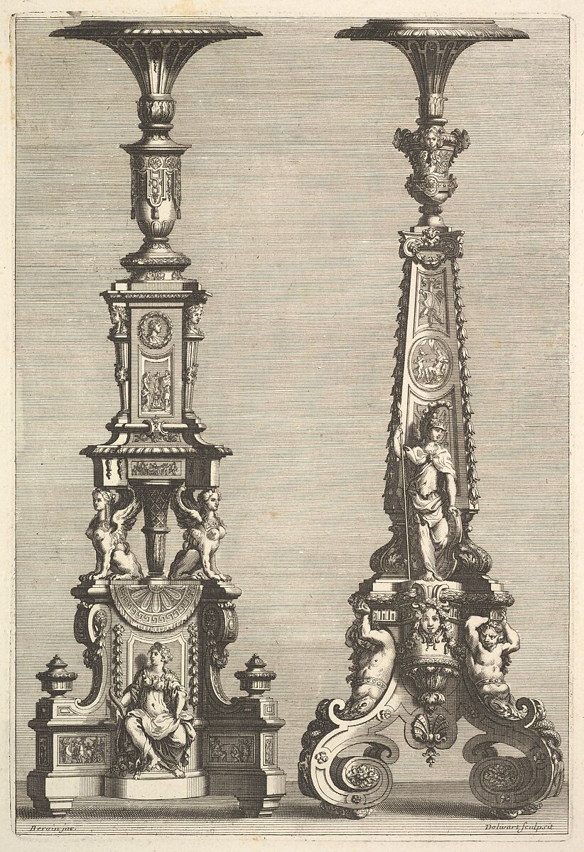 Etching and engraving with designs for two torchères, created by Juan Dolivar after designs by Jean I Berain. Entrusted with drawings for costumes, stage sets, and royal ceremonies at the 'Academie Royale de la Musique' since 1680, Berain's ingenious creations took acanthus and laurel leaves, palmettes and grotesques, mixing them with dancers, acrobats, monkeys and satyrs, to create his own, imaginative, theatrical world. His designs were multiplied and disseminated by means of engravings, his design motifs and manner objects becoming highly influential in the closing years of the seventeenth century.