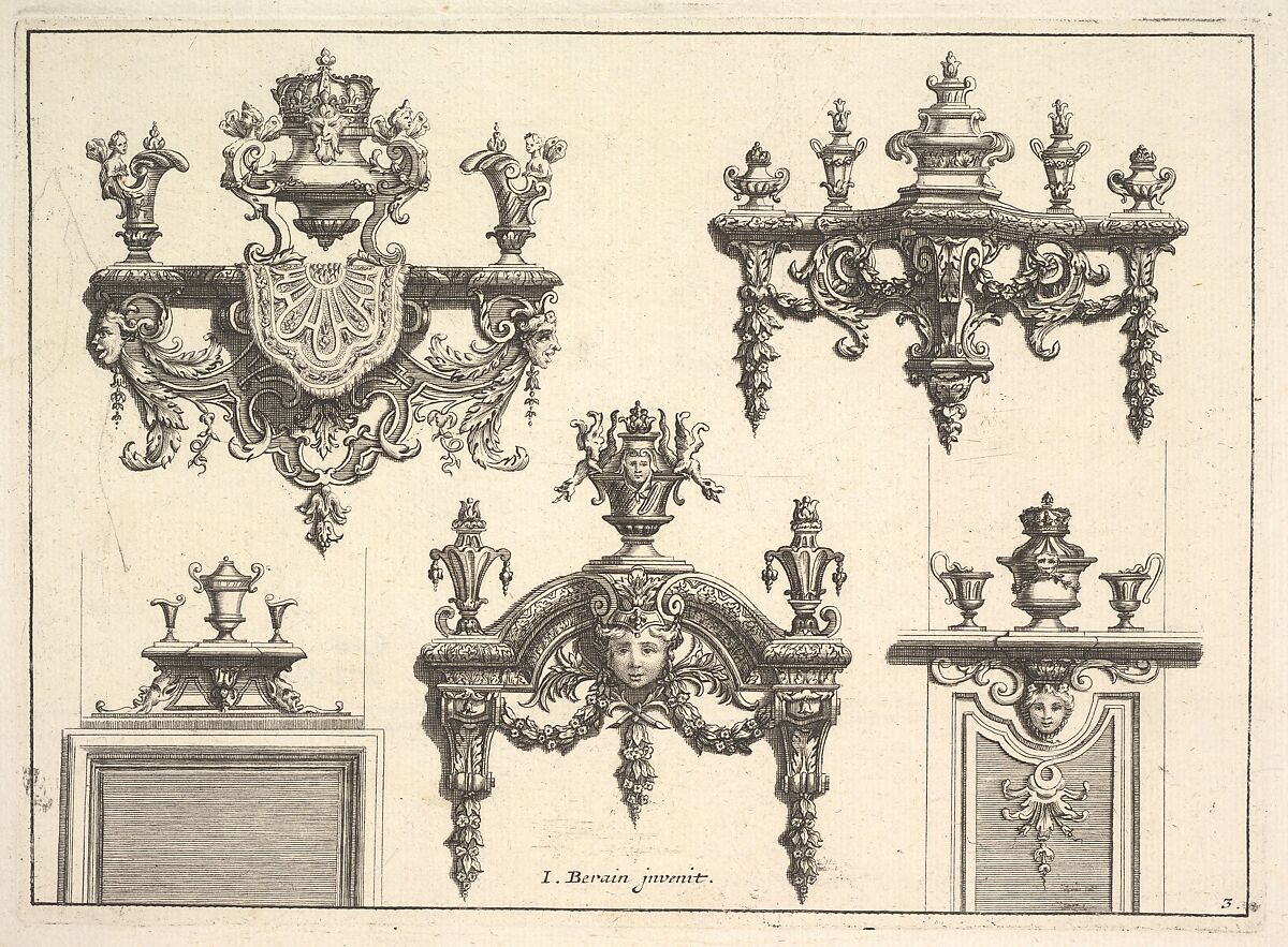 Etching and engraving with designs for brackets with silverwork, designed by Jean I Berain. Entrusted with drawings for costumes, stage sets, and royal ceremonies at the 'Academie Royale de la Musique' since 1680, Berain's ingenious creations took acanthus and laurel leaves, palmettes and grotesques, mixing them with dancers, acrobats, monkeys and satyrs, to create his own, imaginative, theatrical world. His designs were multiplied and disseminated by means of engravings, his design motifs and manner objects becoming highly influential in the closing years of the seventeenth century. This design contains five designs for bracquets in the manner of the time, made up of scrolling strapwork decorated with scrolling acanthus leaves and thin garlands with flowers and leaves, ornamental vases, grotesques, and mythical creatures with human faces and butterfly wings.